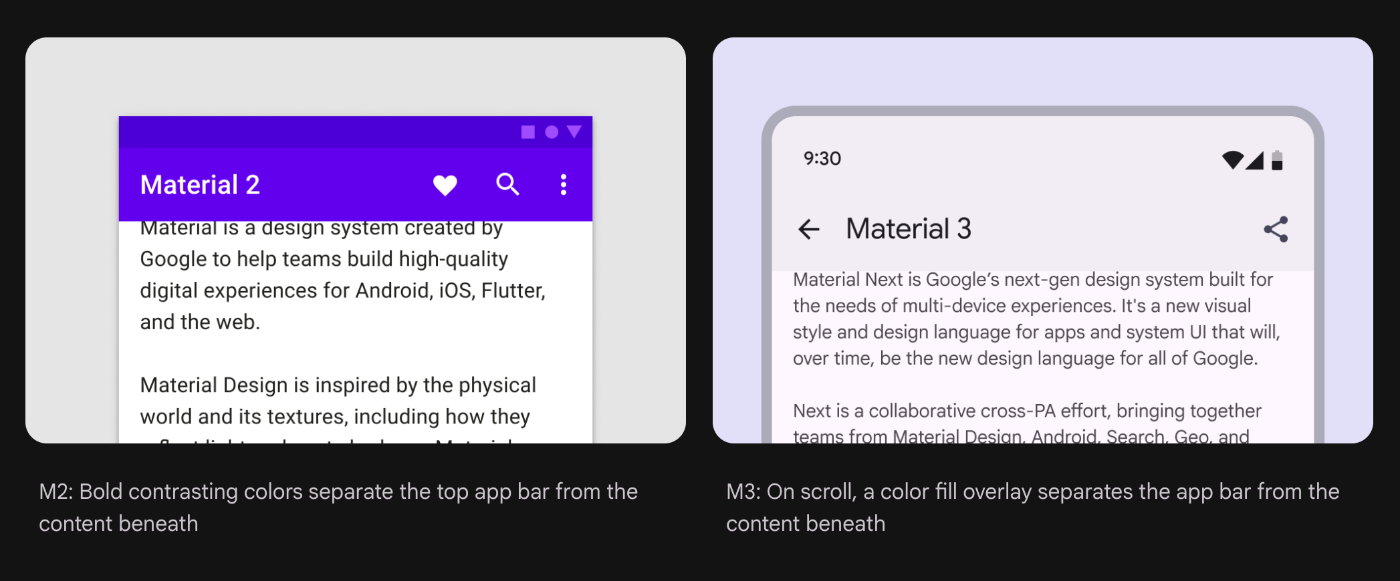 M3:スクロールすると、カラーフィルオーバーレイがAppBarとその下のコンテンツを分離( → つまり、スクロール以前は分離していない)