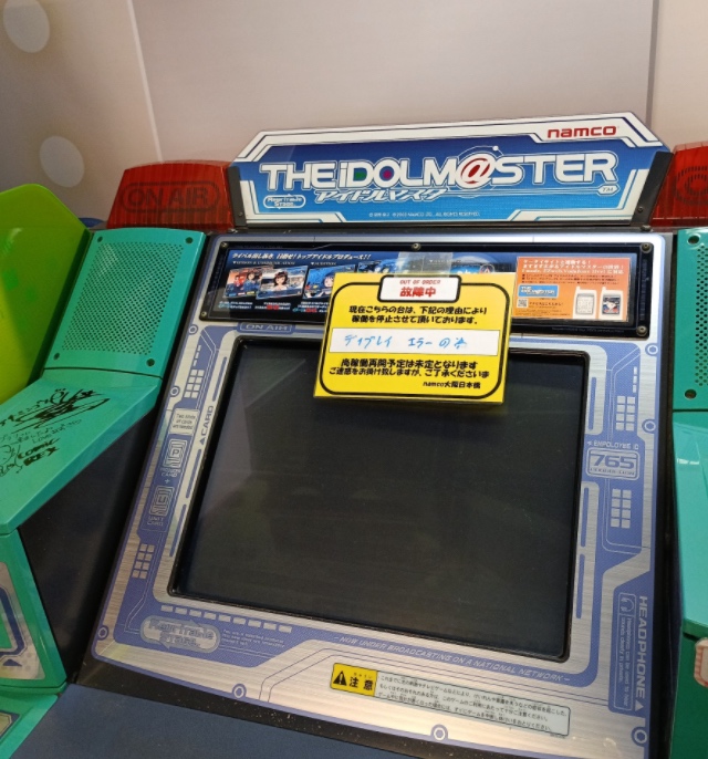 やってない!!!!ディスプレイエラー?!?!?てことはブラウン管の限界?再稼働未定!?!?この前もう一つあったアケマスが撤去されたよね!?!?撤去済みの立川のが確かブラウン管じゃなくて液晶になってたはずだけどどうにかブラウン管のままいて欲しい、でも……20年は、そりゃあそうか。でも見れてよかった。