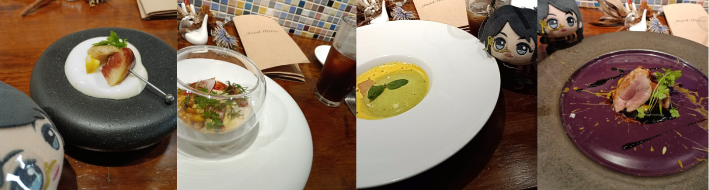 なんでもシャニマスオタクの店主がカジュアルフレンチをやっているお店だとか。全然シャニマス関係なくカップルや家族で来ている人がいた。オタクなの私だけ。汗もかいていてキモい。私はフレンチの作法がマジでわからない。舌もバカで、前までポイフルとタラタラしてんじゃねーよを同時に食って舌をバグらせる遊びをしていた(そんなことするな)。我流で行かせてもらうぜ…と思いながら料理を待つ。ランチAコース。予約する時に己がシャニマスのオタクであることを明かしたからか、私が店に入った時に虹の行方のピアノアレンジが聞こえて極まった。おい、本当にシャニマスオタクの店じゃん。