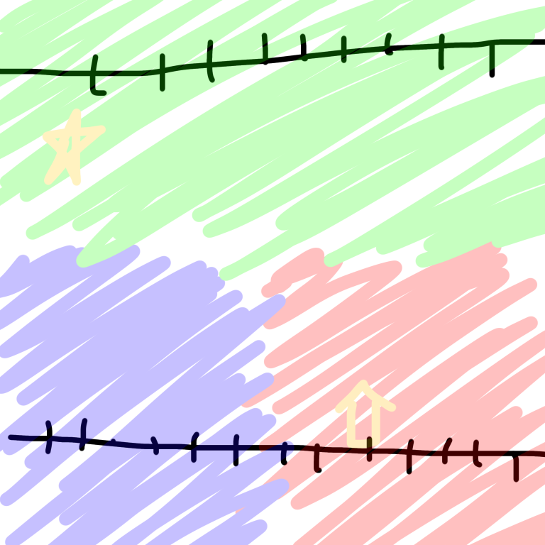 目的地のドムドムハンバーガー(緑エリア・星印)は隣町にあるが、隣町と言っても仮の家(赤エリア・家印)からかなり斜めに進むので、実際は隣町でも気持ちは√隣の隣町という感じがする。 ←?