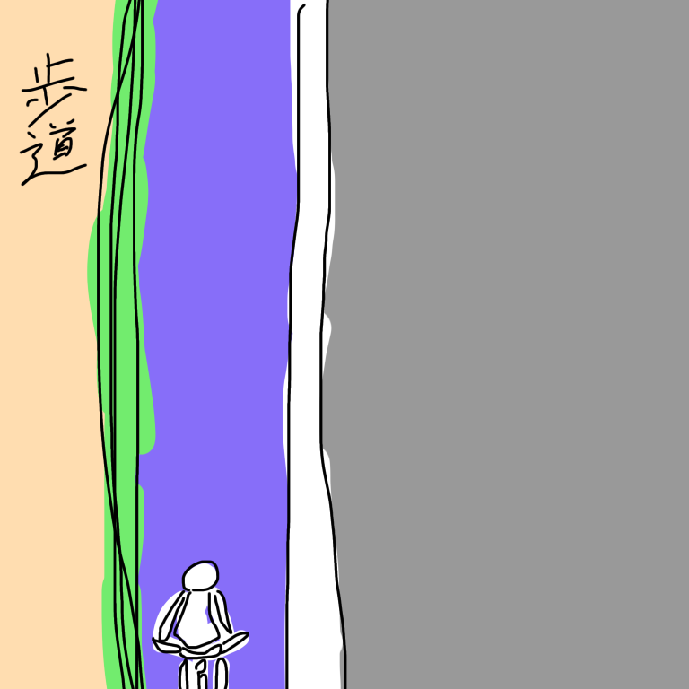 幸い、歩道が広いので歩道を行きます。ちゃんと↑この看板があるところを行きました。免許は持っていないが、これくらいの交通マナーはしっかり守る。