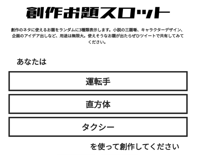 仮ニックネームが4体並ぶ光景は滑稽なので、記事を書くために、カスお題スロットを回します。小説かイラストか、何になるかは分かりませんが何かで創作します。震えろ。