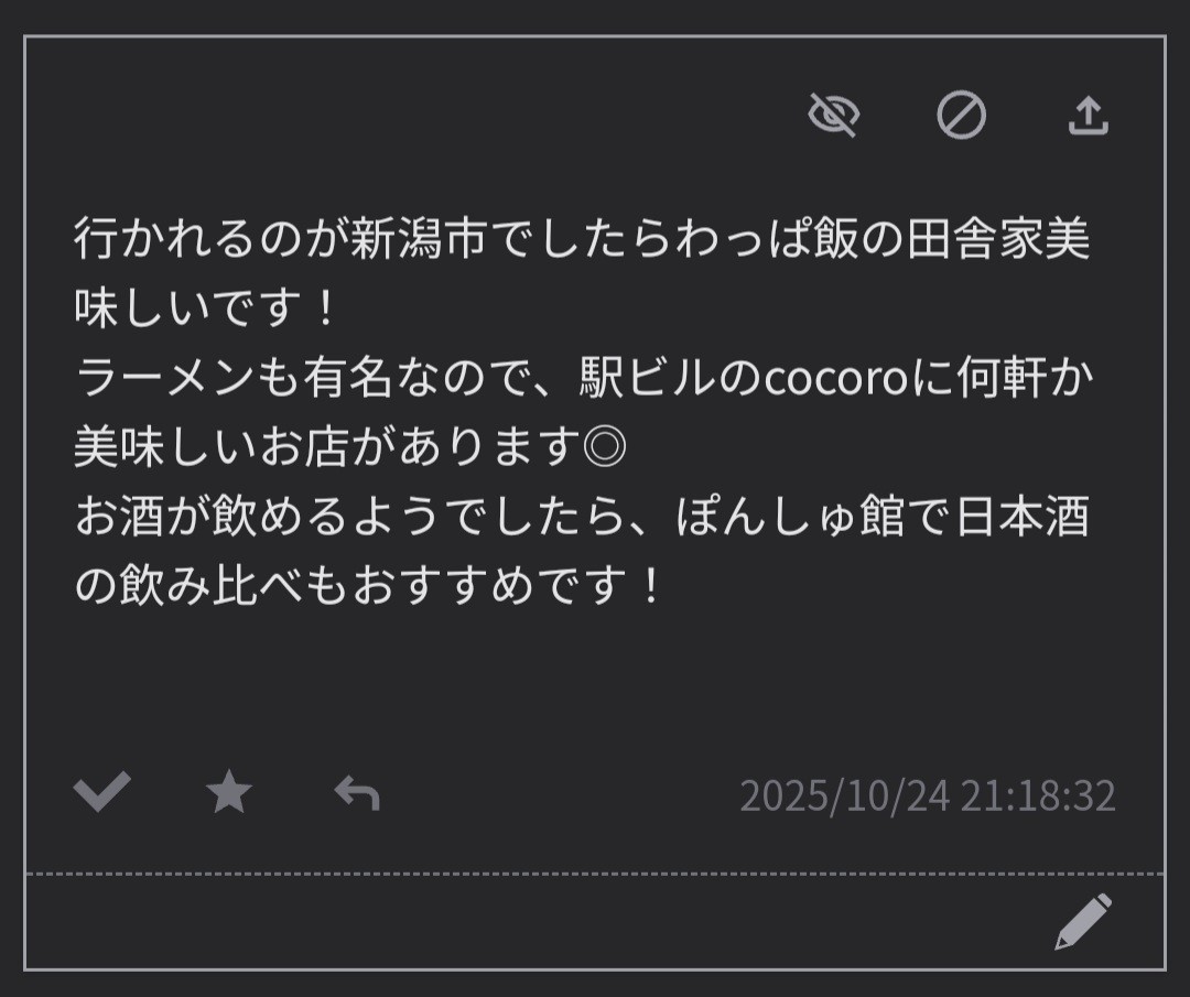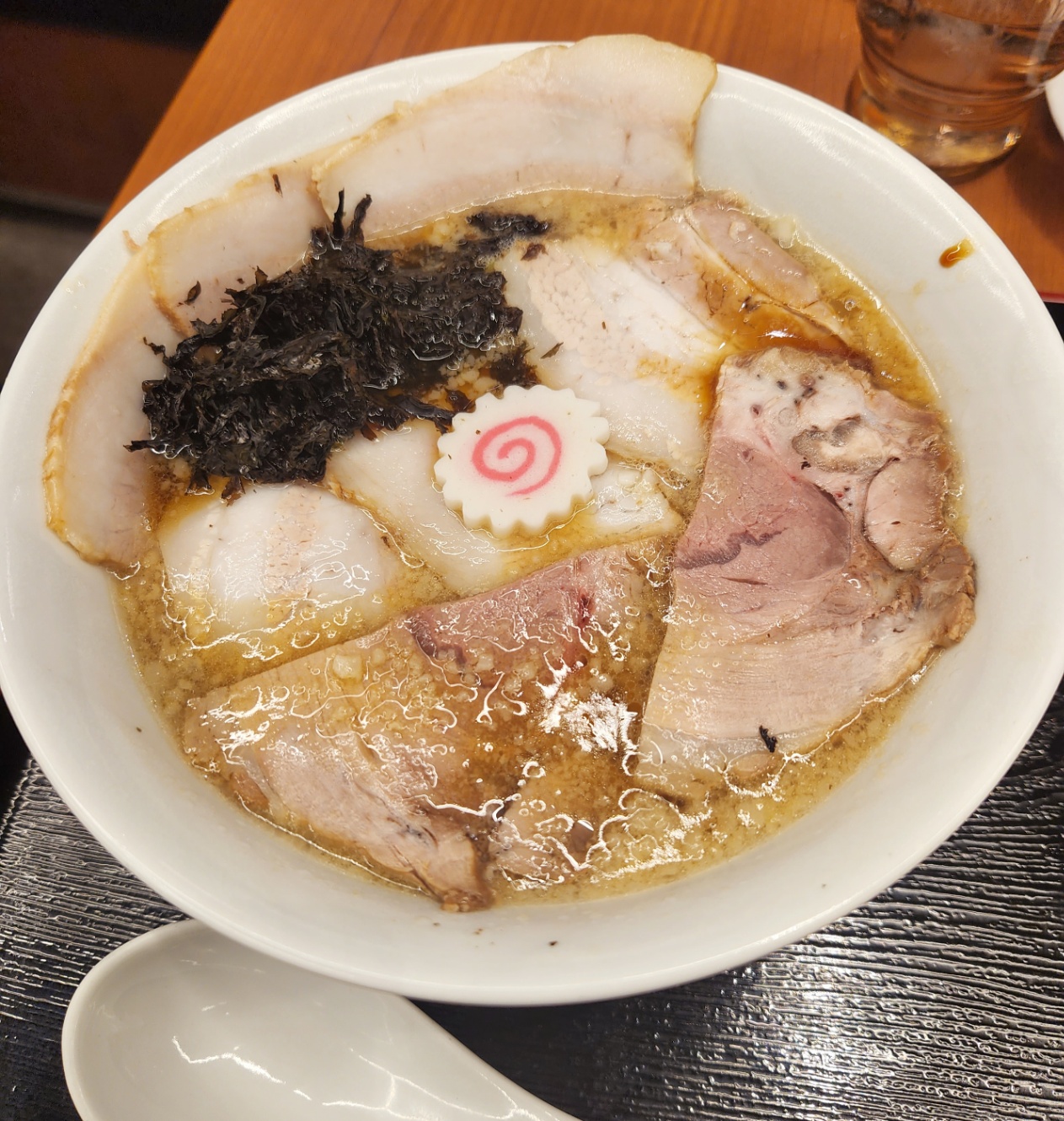 看板観ていちばん美味しそうで新潟って書いてあるラーメン屋さんに入りました!これは家系というやつ…?こういうラーメンをはじめて食べました。すごく美味しかったんですが、普通盛りでも食べきるのが大変で、上のチャーシューは持ち帰ってホテルで食べました。それも美味しかった…💓