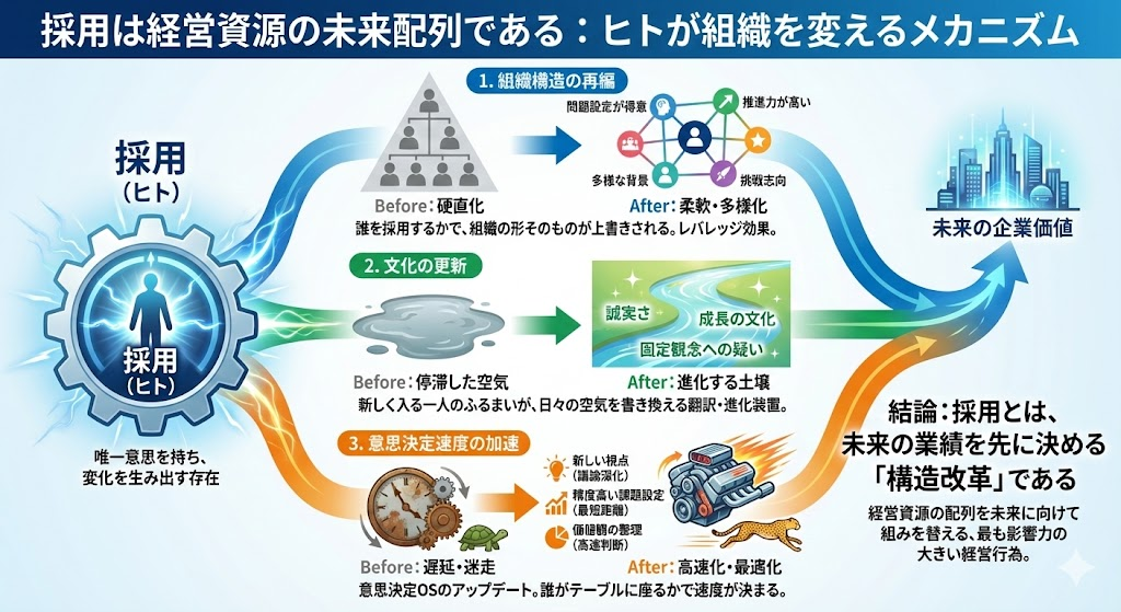 だから採用は、単なる人員補充ではありません。 企業が持つ経営資源の配列そのものを再設計する行為です。