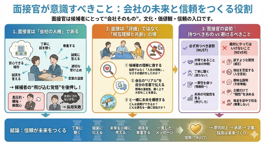ここでは、面接官が意識すべき姿勢や、面接を信頼の場にするためのポイントをまとめます。
