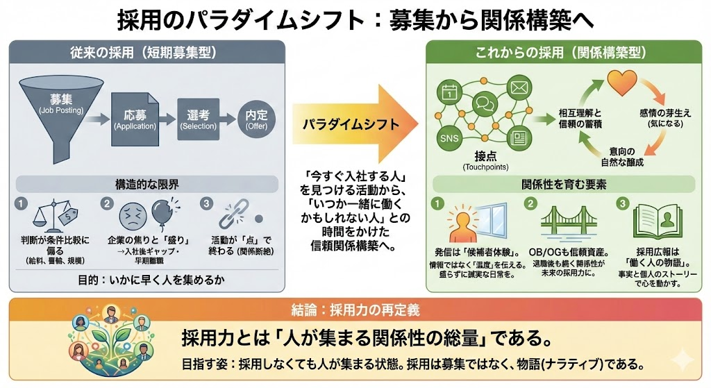 これからの採用は、「今すぐ入社する人」を見つける活動ではなく、 「いつか一緒に働くかもしれない人」との関係を、時間をかけて育てていく営みへと変わってきています。