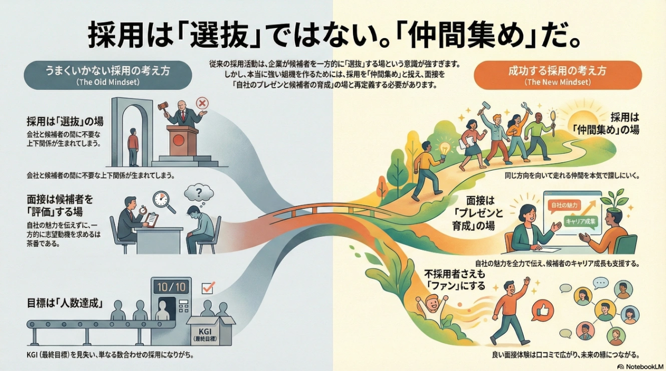 面接を「企業が候補者を評価する場」から、「候補者をその場で成長させ、自社のファンにするプレゼンの場」へと再定義することにあります。