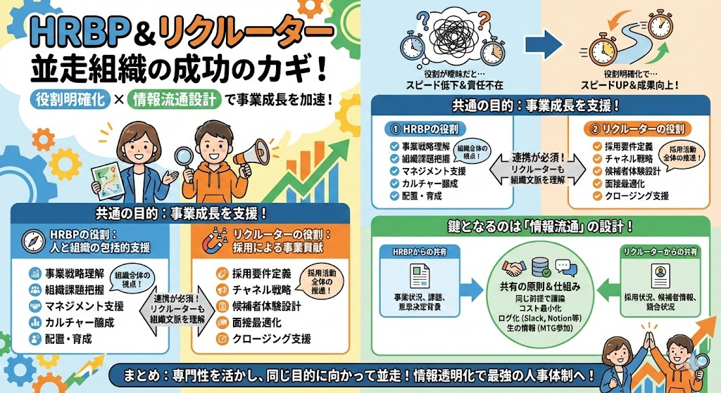 本記事では、HRBPとリクルーターが並走する組織において、役割を明確にすることと、情報の流れを設計することの重要性について整理します。