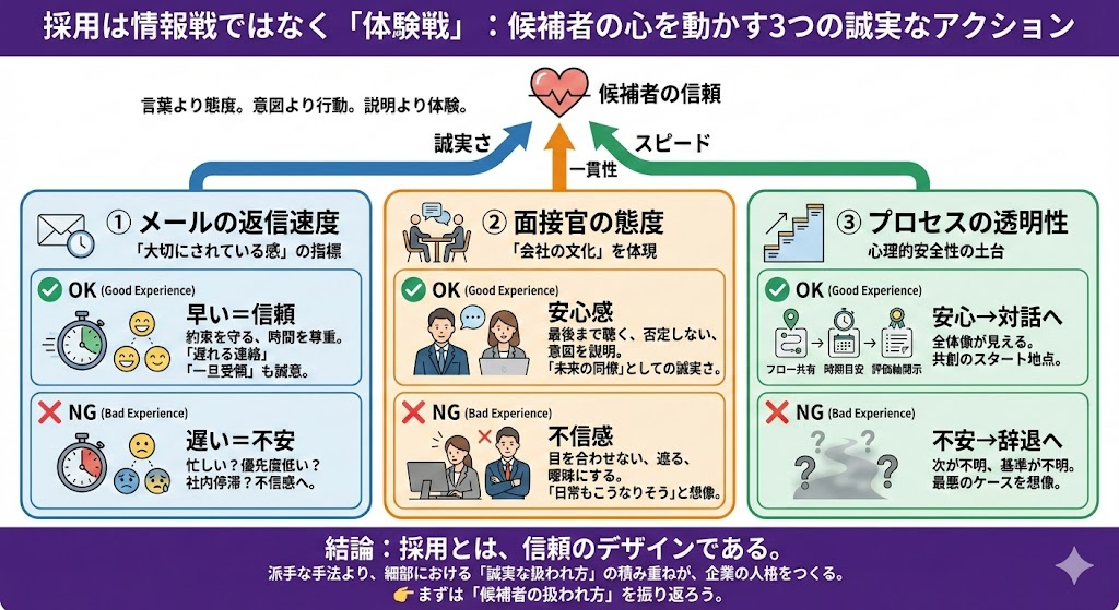 採用とは、信頼のデザインです。 そして信頼は、一度のプレゼンテーションや言葉の巧みさではなく、細部における誠実さの積み重ねからしか生まれません。