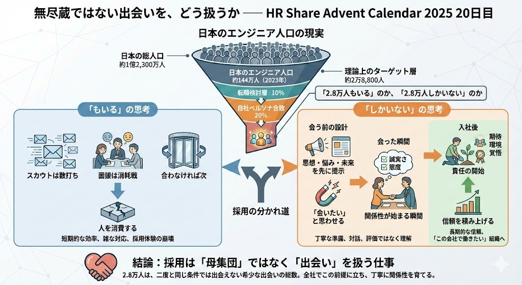 採用は、出会いを大事にし、関係性を育てる仕事です。 2.8万人という数字は、母集団の話ではありません。