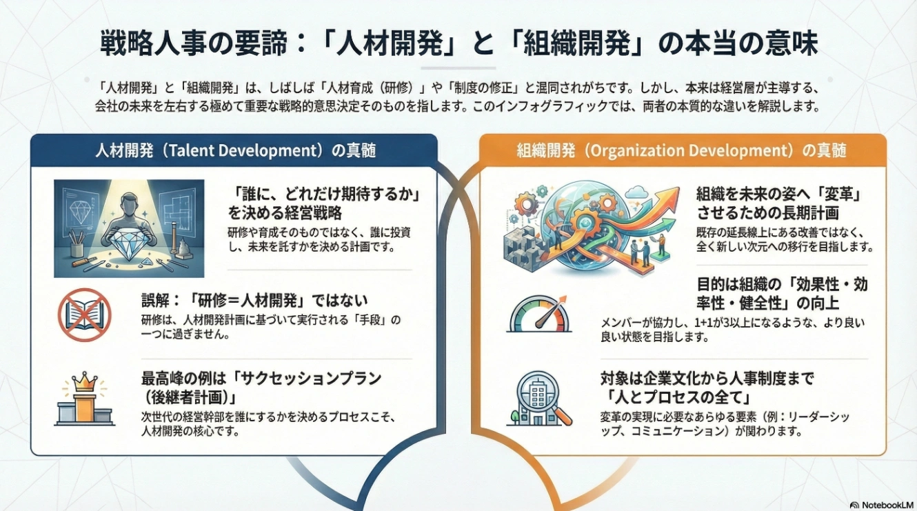 組織開発(箱や関係性の変革)と人材開発(誰をどこに配置するか)は、車の両輪のように噛み合っていなければなりません。 「新しい組織図(組織開発)」を描いた上で、「そこに誰を配置し、事前にどうトレーニングするか(人材開発)」が決まるため、経営者やボードメンバーが本気で答えを出さなければならない経営課題とされています。