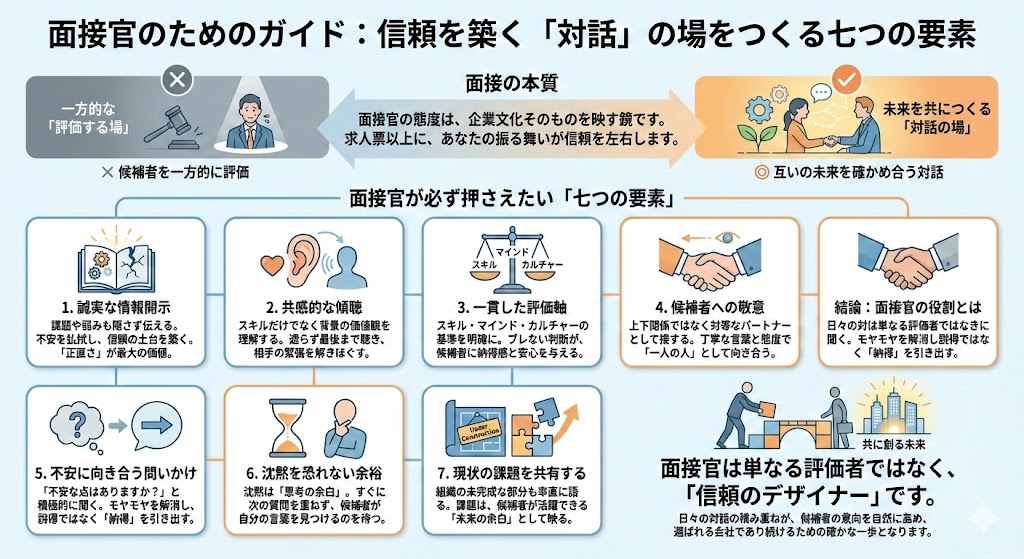 その意味で、面接官には専門知識と同じくらい、誠実さや共感力が求められます。 ここでは、面接官が必ず押さえておきたい七つの要素を整理していきます。