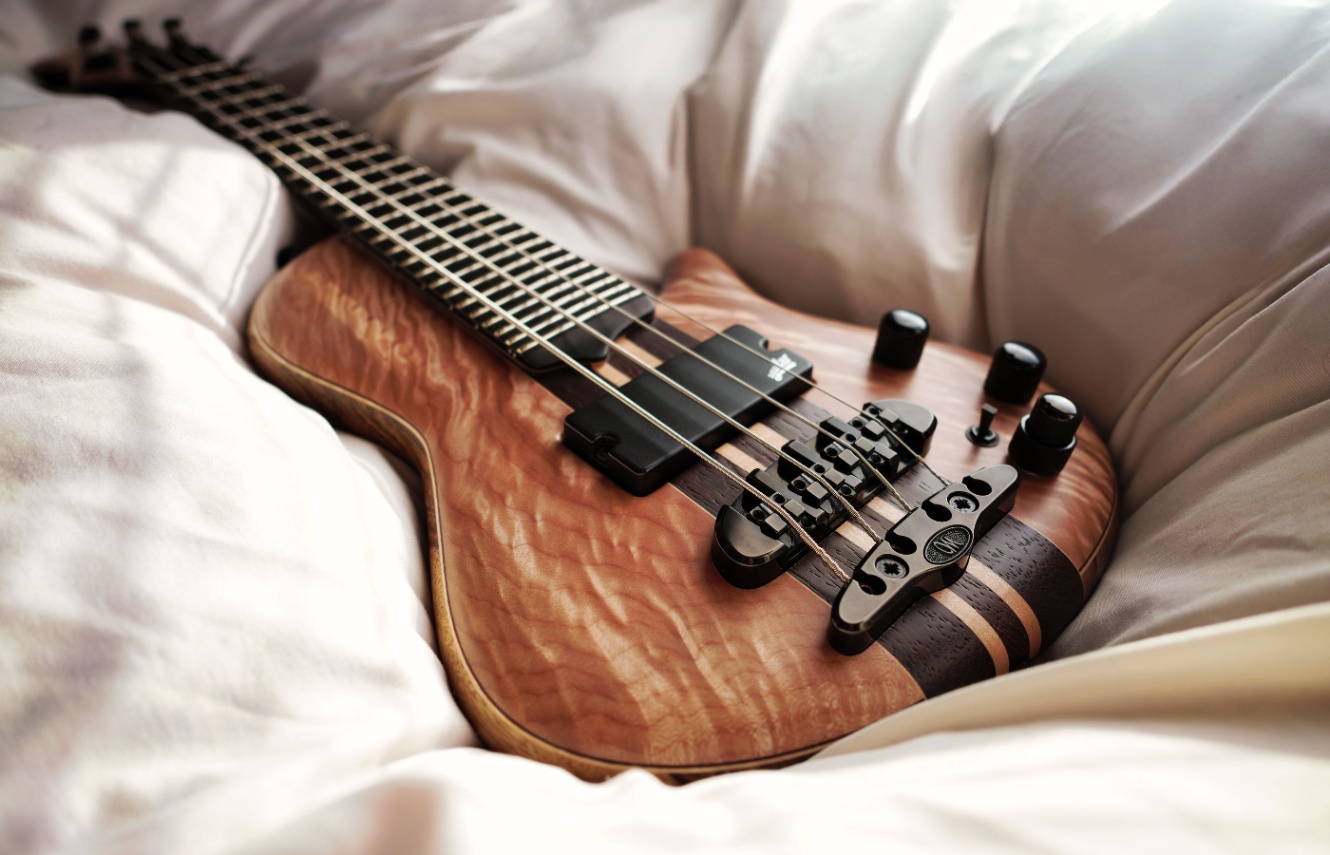 ウェンジ&メイプルの積層スルーネック構造。ウイング材トップはフィギュアドメイプル、バック材はブラックリンバという構成。