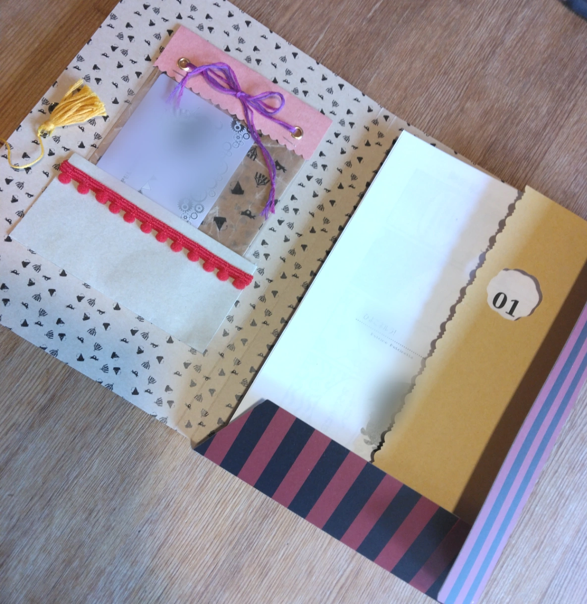 A3厚紙を自分でカットして組み立てて、右側は本収納スペース、左側には別紙で作ったポケットを付けています。ポンポンレースが可愛いと自画自賛。