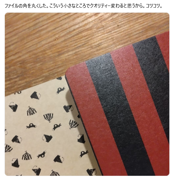 角は100均の角丸コーナーパンチ。100均といえども、がんがん使えます。角を丸くしただけでなんだか凝ってるように見えて、これは良い。