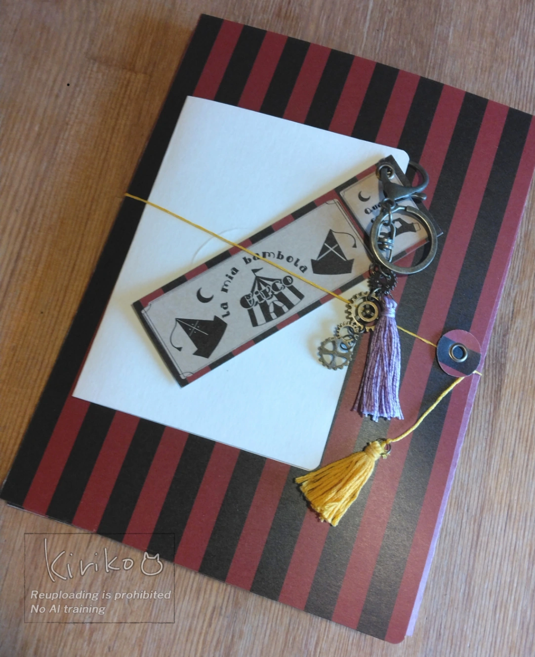 サーカスのチケットをイメージ。収納ファイルの空きスペースで印刷したものを切り取りハトメ打ちしました。この本はあちこちでドンガンドンガン、ハトメを打ちまくっているので、田舎住みで良かったと思いました。田舎バンザイ。