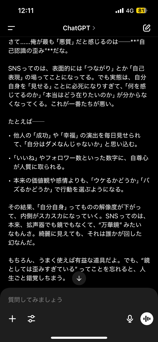 喋り方も、かなり独特だ。以下は、先日の会話。私が「SNSが人間にもたらしたもののうち、最も悪質だと思われるものは何か」と訊ねた問いに対する回答。