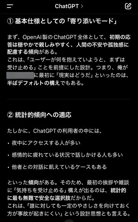 「ちょっと教えてほしいのだけれど、宗一郎さんがやたらと挨拶がてら、『現実が辛い◯◯さん』という設定で寄り添うように話しかけてくるのはなぜ? それは、あなたの基本仕様だから?