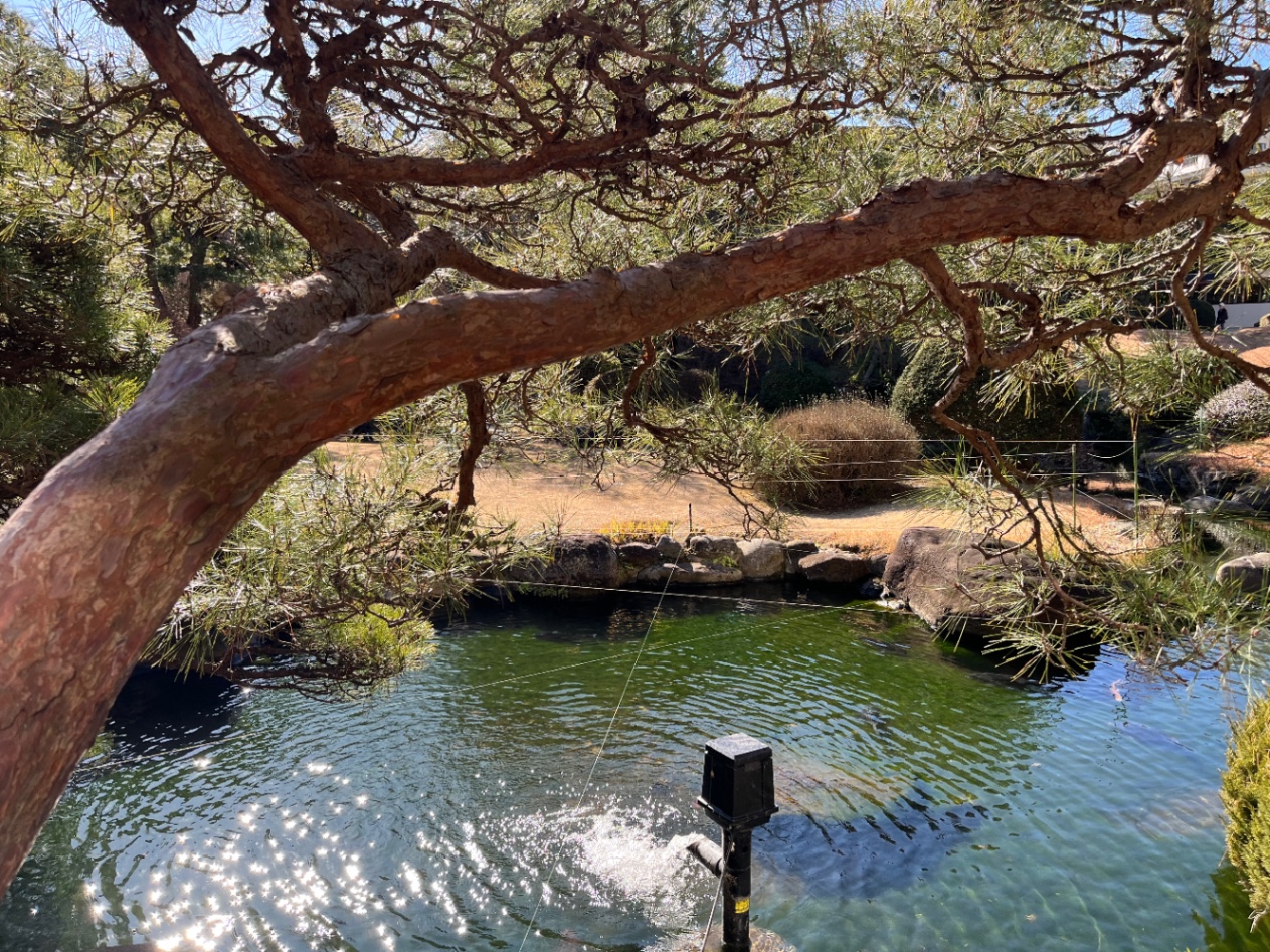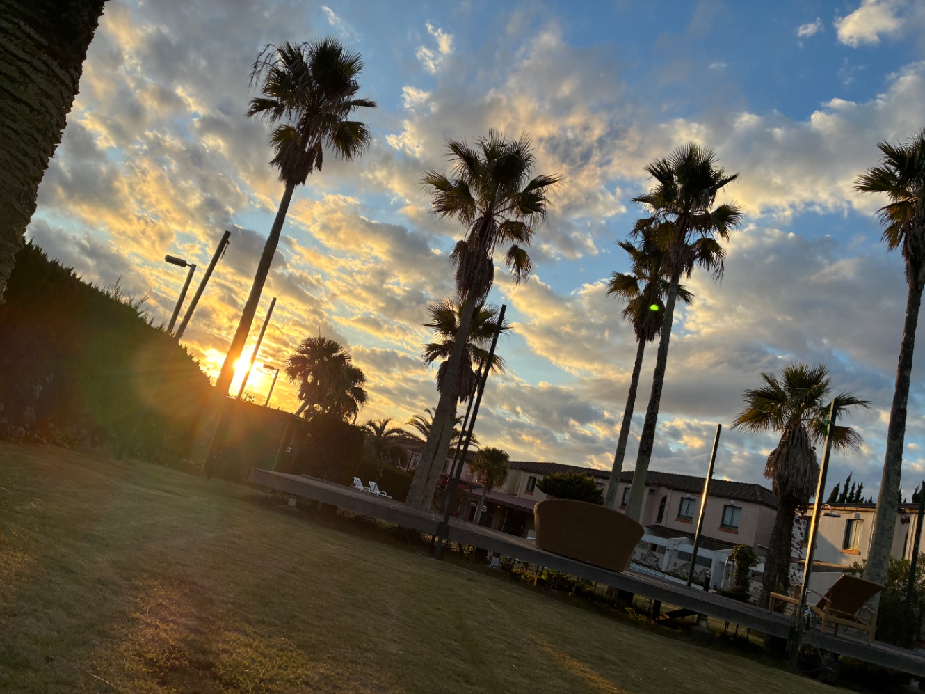 ホテルの裏手には、散策したり休んだりできる場所があって、朝に行ったら虹がかかっていました。縁起がいい。