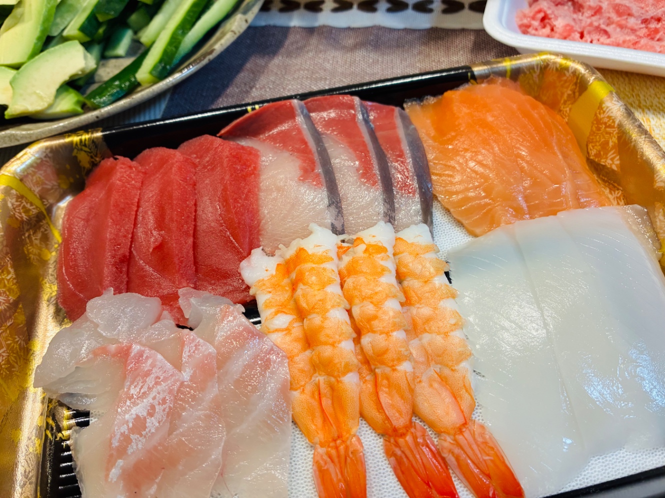 帰り近所にある、いつも美味しい刺身と寿司が売っている鮮魚店で手巻き寿司ダネを買った。