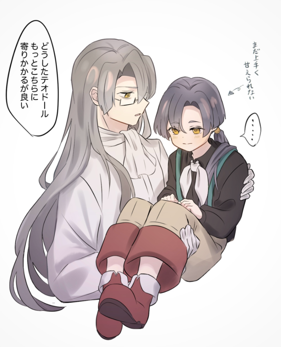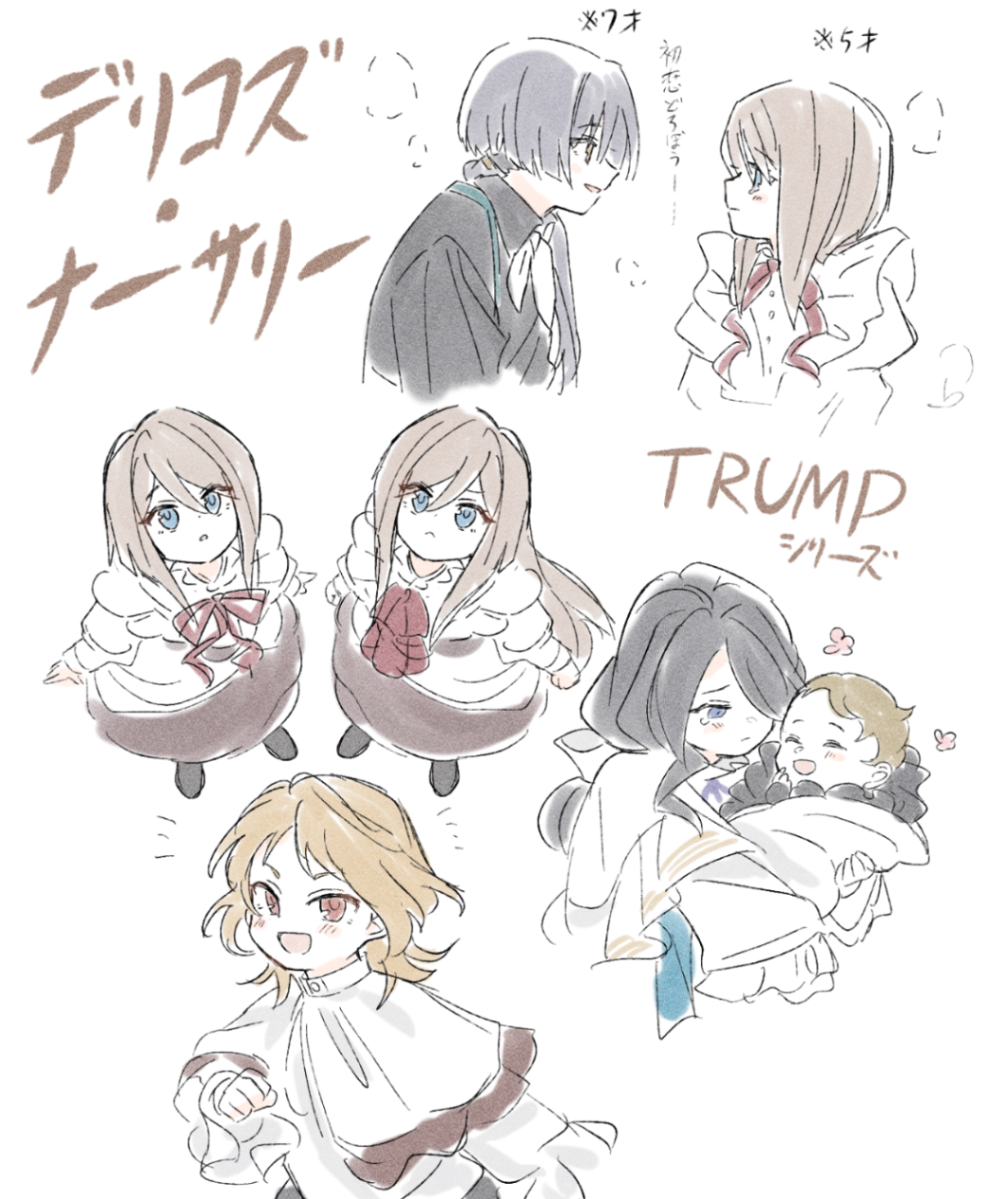 そして落書き1枚目は今アニメやってるTRUMPシリーズの中の一つ「デリコズ・ナーサリー」の推し親子、ディーノ卿とテオドールくん、2枚目は出てくる子供たちの落書きです。フィクションにおける親子の雪解け描写大好きなのでやられちゃった。でもすごい非情なシリーズ(めっちゃ人死ぬ)らしいので死なないよう祈るばかり。アニメ終わったら次は原作舞台見ます。