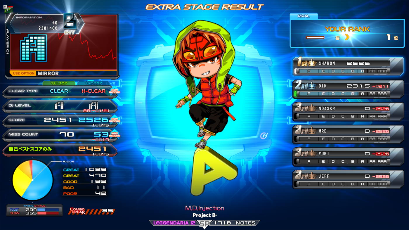 言うまでもなく、ジャリジャリごちゃごちゃした配置でゲージを残せるかにかかってる譜面です。1Pだと鏡が割と押しやすい配置になりますが、地力不足でやりすぎたせいか、変な癖を感じるのでR乱でいきました。