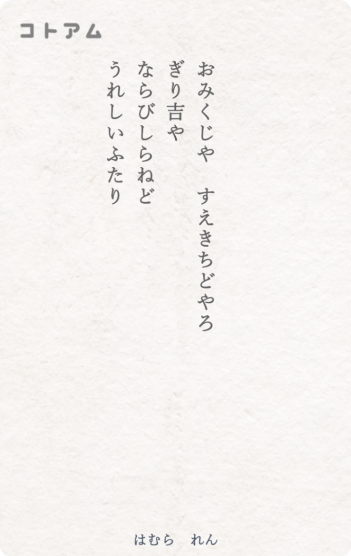 小吉と末吉の順番がわからないようで、どっちや?どっちや?と楽しそうに言い続けていたお二人さんの会話に声を出して笑いそうになった。