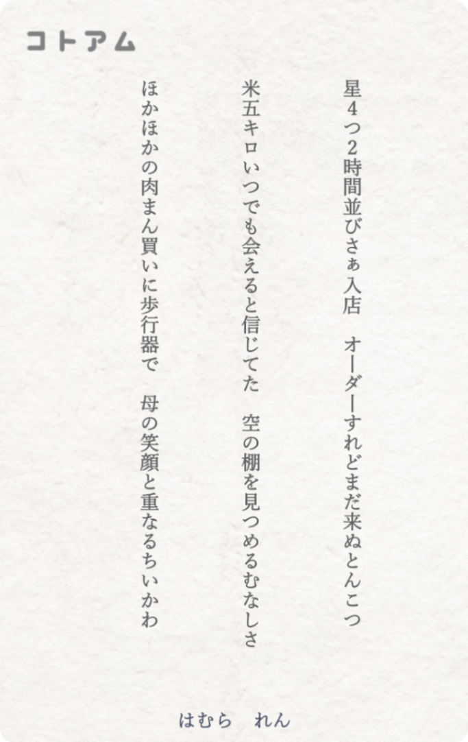 頭の中が年末前の親の体調不良で大混乱していたにも関わらず、ちょこちょこネタをノートの空きスペースに書き溜めていて、先月頭を打撲した後、なぜか吹っ切れたように下手でも考えてる言葉を今投稿するしかない!と勢いでコトアムアプリをダウンロードして投稿した。