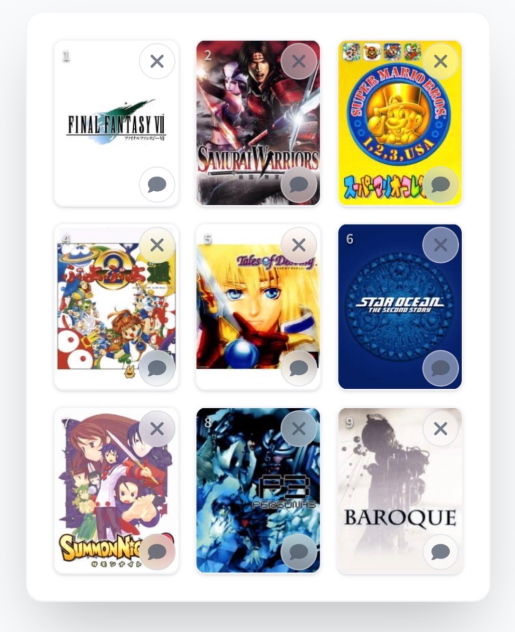 昨晩、ちょっと前に流行っていた『私を構成する9つのゲーム』というのをやってみた。とりあえず埋めて一晩寝かそうと思い保留中だ。これを入れるなら他にも入れたいのあるなとか、迷う迷う。