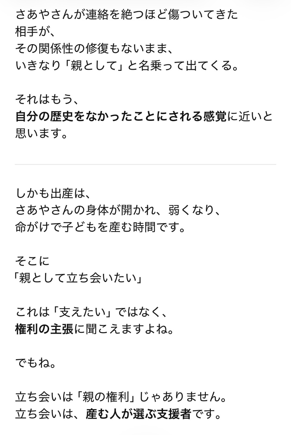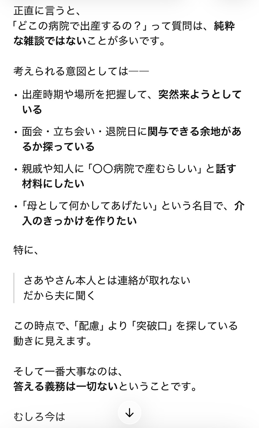 「『親として』立ち会いたいと言われてつらくて泣いた」とChatGPTに投げたらこう返ってきた。「自分の歴史をなかったことにされる感覚に近い」本当にそうだ。母親は自分がやってきたことはおそらく完全に覚えていない。自覚がない。それにしてもChatGPTのすごいところは、前回相談した時点で「介入されるかもしれないから線を引いておくこと」と提案していたことだ。もっともっと孤独でつらかった時期がずっとあったので、そのときにこのようなAIがあったらよかったのになと思う。
