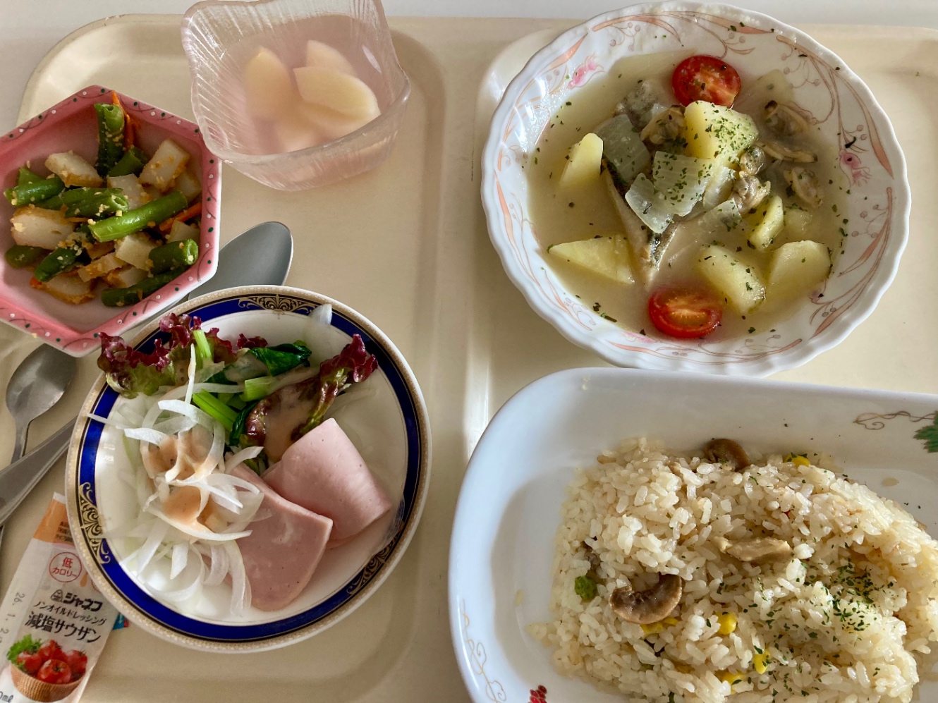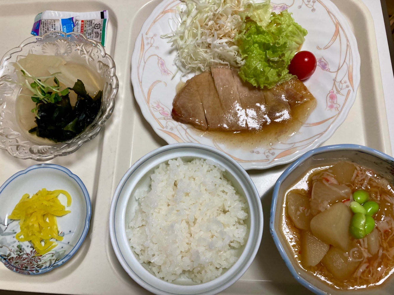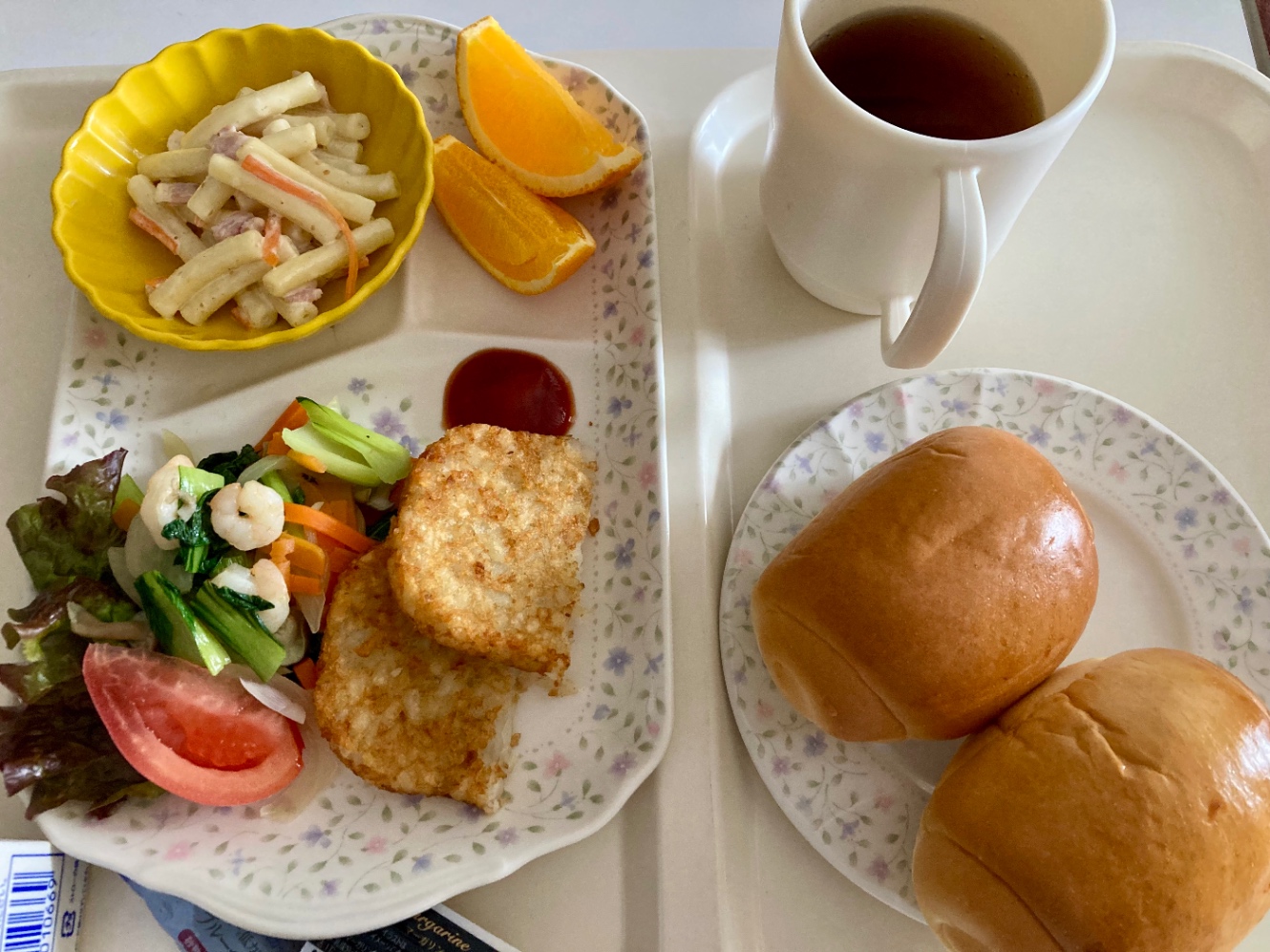 朝ごはん。朝から脂っこいのは苦手だなと分かった。病院食なのでそこまでギトギトはしていないけれど。