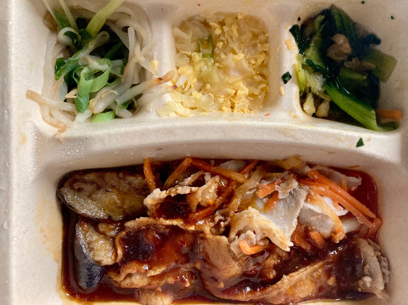 ナッシュ。副菜は左からねぎともやしの塩だれ、キャベツと卵のチリソース、チンゲン菜の生姜醤油。主菜には細かなにんじんが混ざっている。