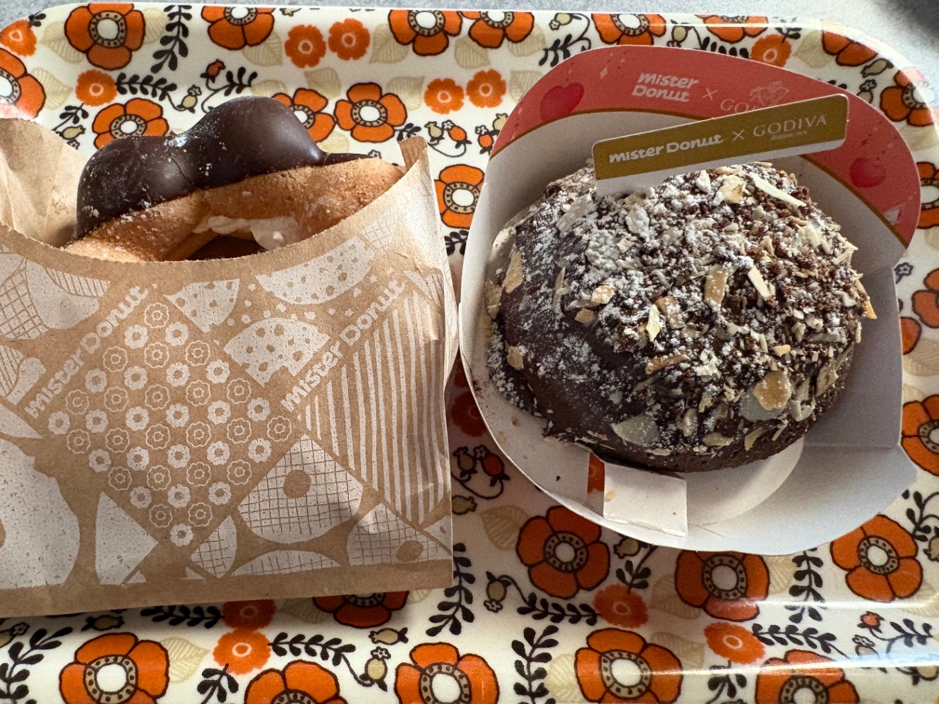 ミスドの写真も載っけとこ。右はゴディバとのコラボ。左はポンデリングで生クリームが挟んであるタイプのは初めて食べた。甘いもので気持ち癒やされたけど、今まだ全然起き上がれませんわ…