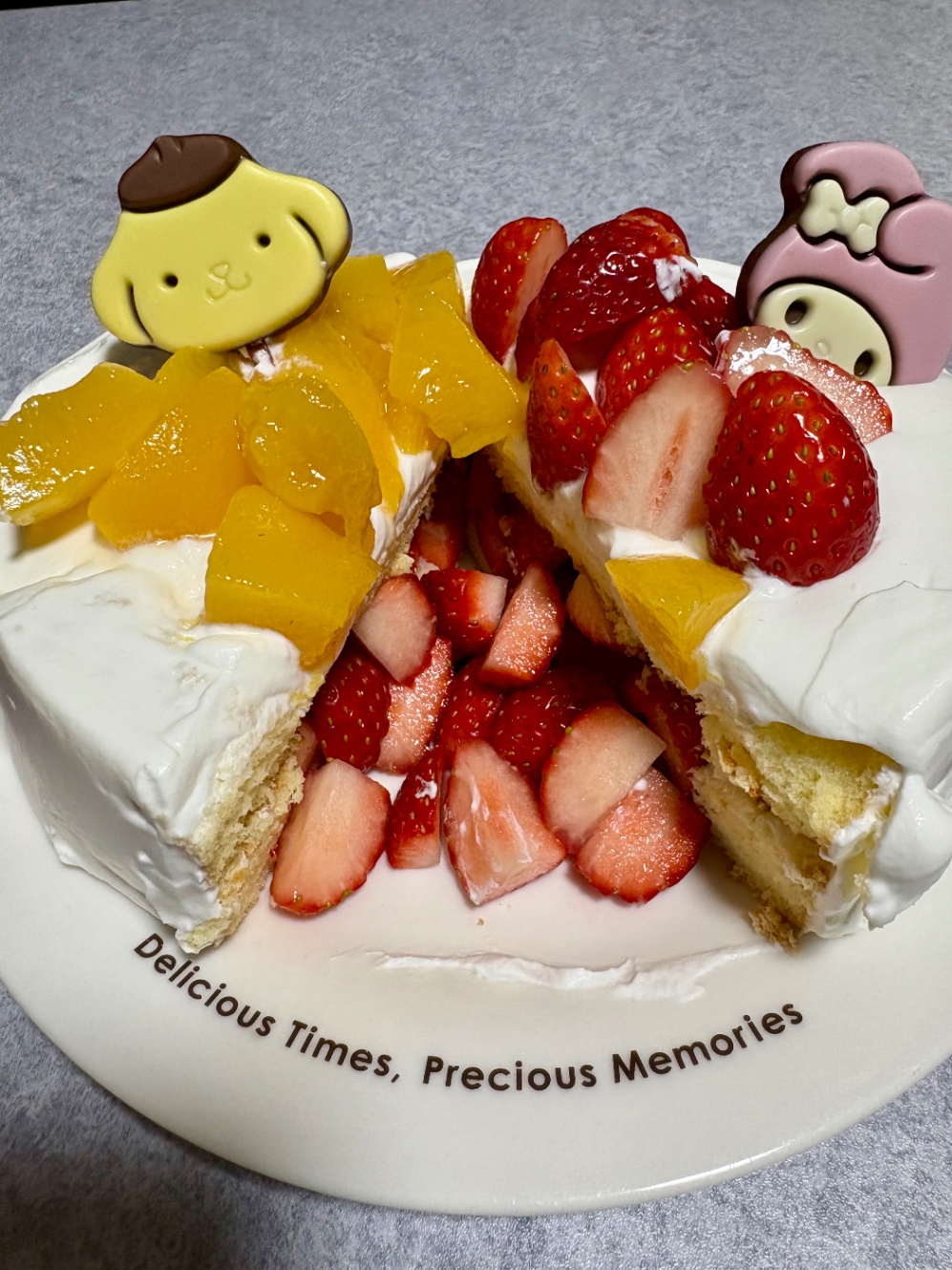 夫は以前から「ジェンダーリビールケーキを作りたい」と言っていた。ジェンダーリビールとは、「(赤ちゃんの)性別を発表する」という意味らしい。主に妻から夫に仕掛けるサプライズイベントたが、夫が言い出したときには「なんだそれ?」と私は無知だった。ケーキをパカッと開けると中に詰められた果物で男の子か女の子か分かる、という仕組みだ。うちは黄桃だと男の子、いちごだと女の子というふうにした。夫がケーキを作り、スポンジをくり抜いたところで私が果物を詰め込み蓋をし、再度夫が盛り付けて完成。