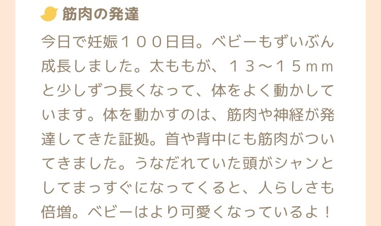 「今日で妊娠100日目。」本日のアドバイスに書かれていた。やっとか…そしてあと180日もあるのか…2倍近くじゃん。長いな。