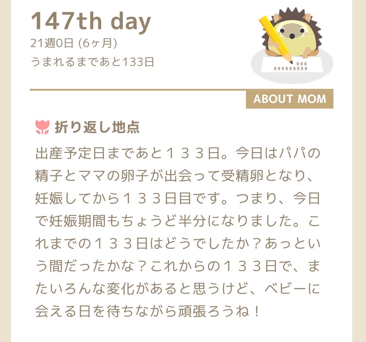 妊娠21週突入。折り返し地点らしい。いろいろあったな。体重は今月に入ってから、まだ半月なのに1kg増えた。といってもまだ妊娠前から+3kgで、妊娠期間に増えていい体重が+10kg〜13kgだから、これからどんどん重くなるということになる。えらいことだ。おなかを締め付けるアンダーウェアはとうに履かなくなってるし、歩くスピードもとうに遅い。最近はごはんを食べ終わったあとに立ち上がるのが一苦労になってきた。さっき1分ほどしゃがみポーズをしていて立ち上がったら、下腹部が激痛でこりゃいかんとなった。幸い30秒くらいで治ったが、気の抜けない30秒だった。