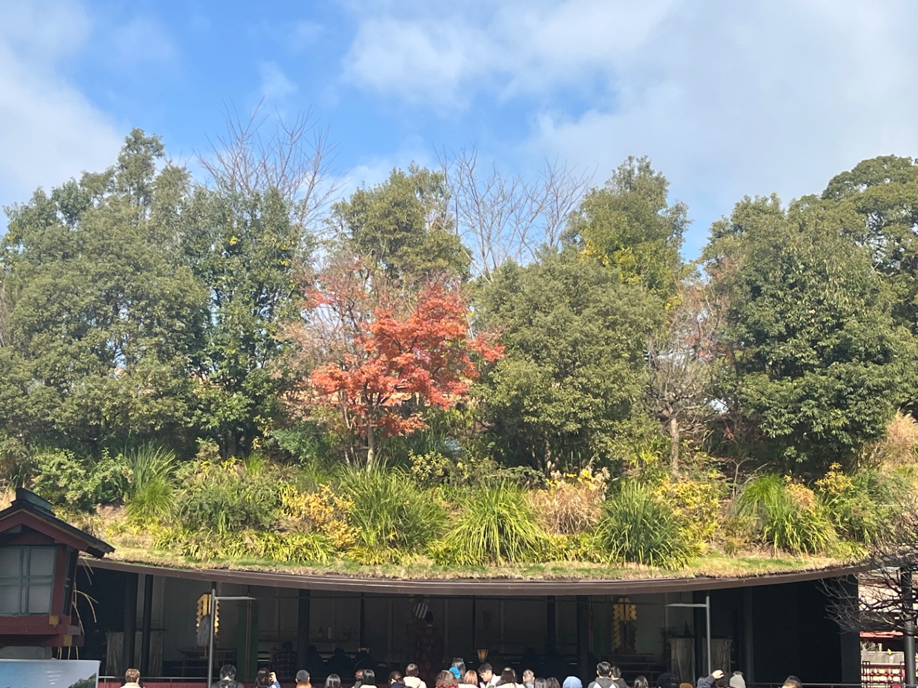 今回の観光は太宰府がメイン。太宰府天満宮は2023年から本殿が大規模改修工事中で、2026年の5月くらいまで仮殿が置かれている。建築家の藤本壮介さんが手がけている建物なんだけど、楼門をくぐったら視界に森が広がって驚いた。こんな感じ。