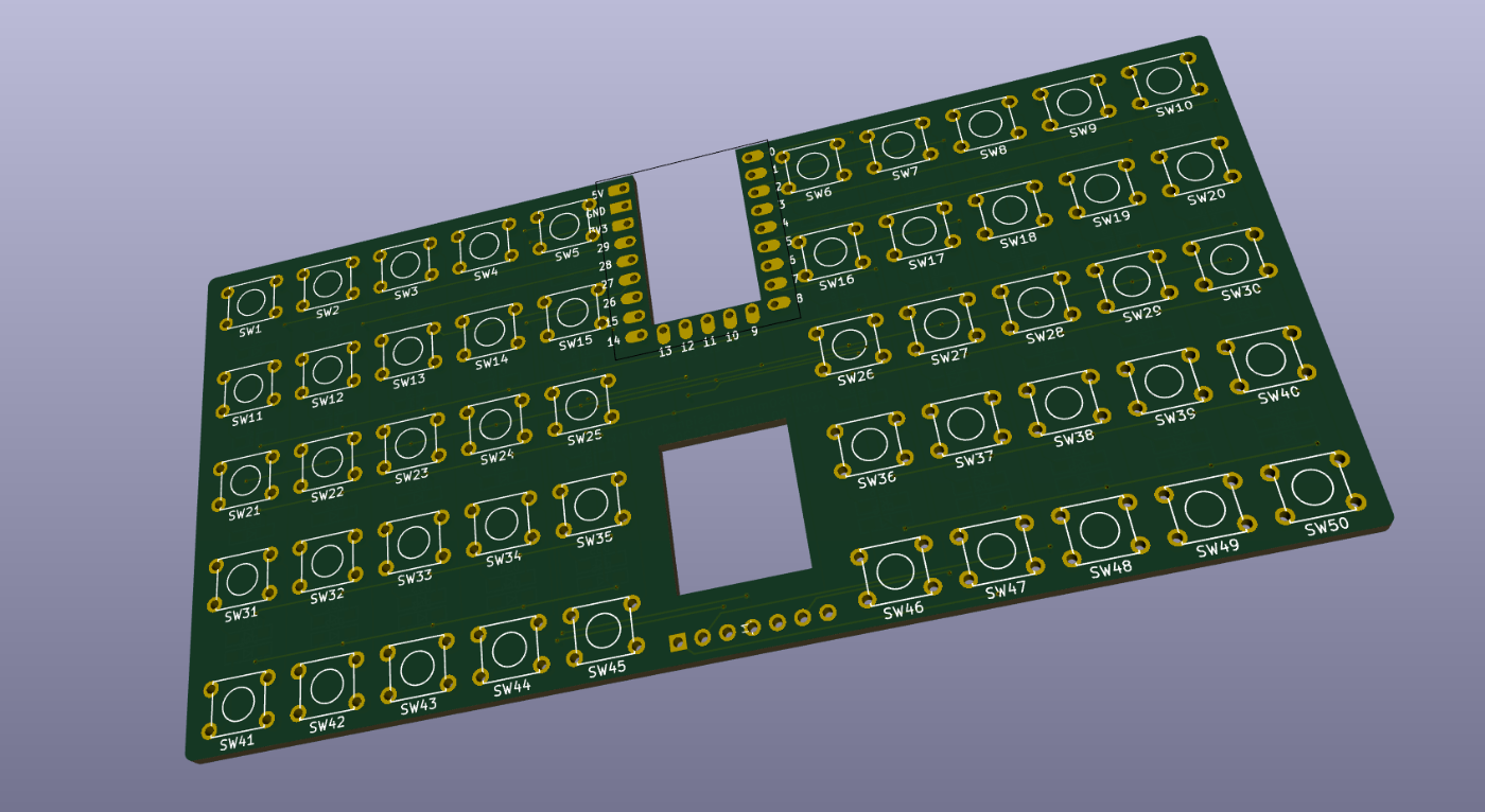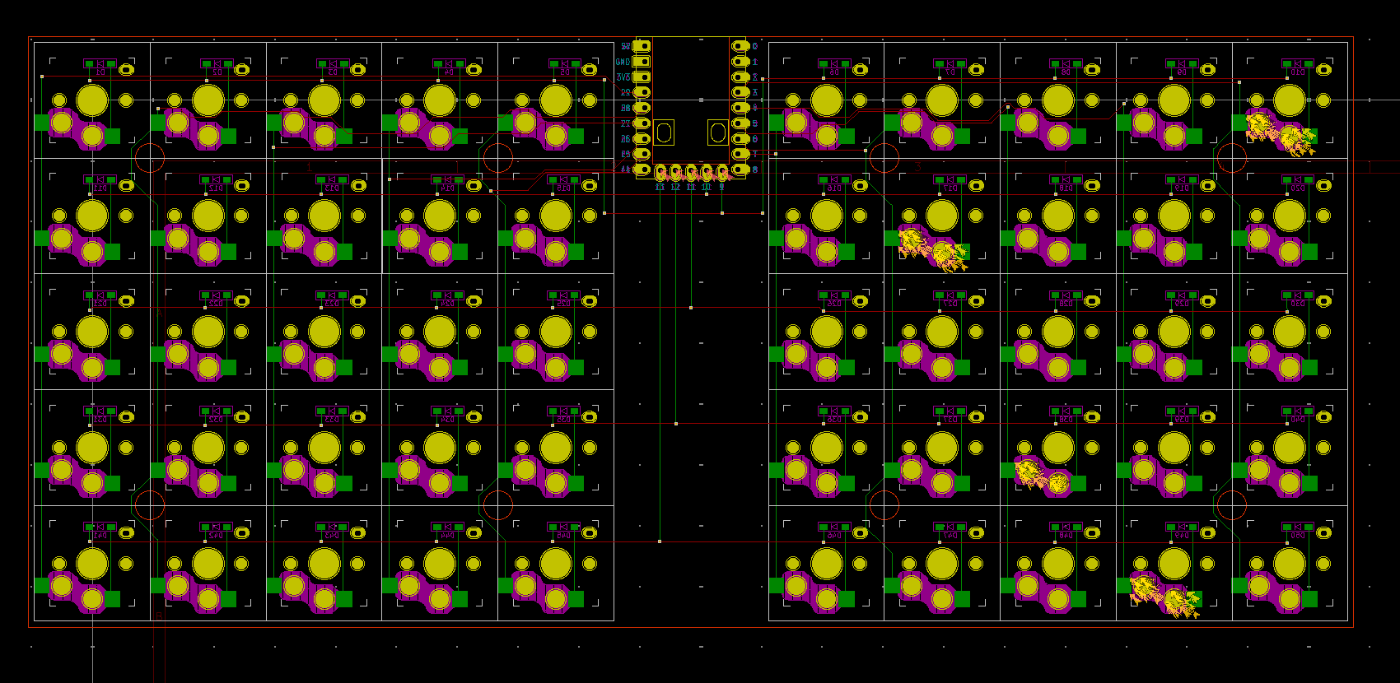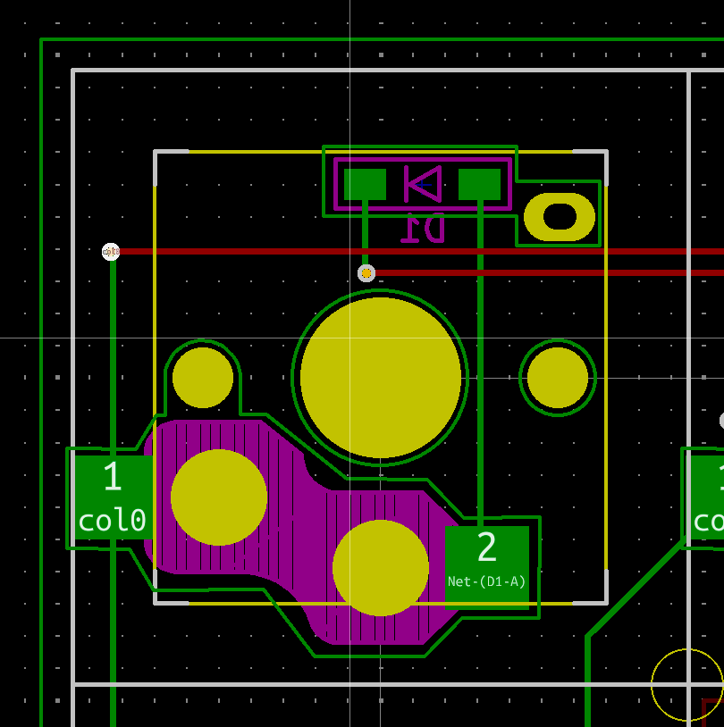 上の画像は、スイッチソケットとダイオードのフットプリントを参考に、部品の周囲に緑色の線(User.Eco1レイヤー)で囲んでいきます。この後に、kicadからdxfファイルを出力して、FUSIONに取り込んで、ケースを作ります。