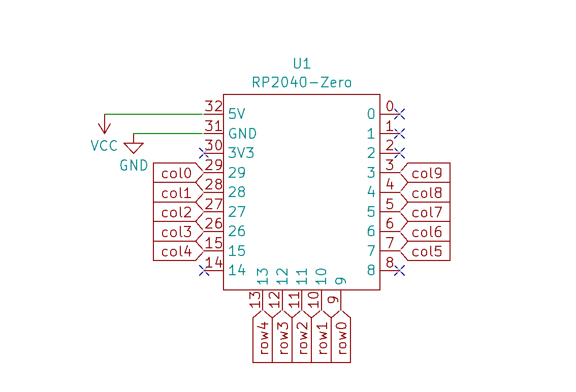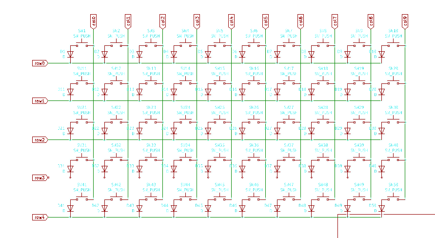 Kicadでとりあえず、回路図を作成しました。縦(col)10 ×横(row)5のマトリクス方式になります。