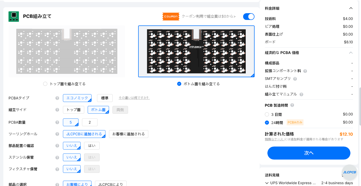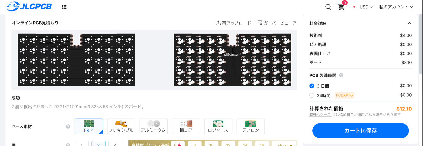 午前中から設計を始めて、夕方、JLCPCBに発注しました。これで、2週間ぐらい(?)、届くのを待つだけです。