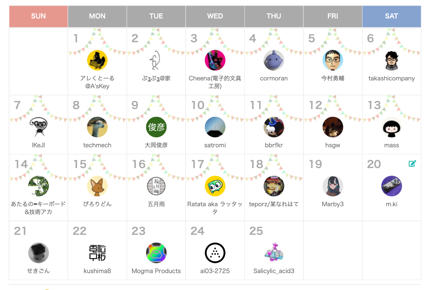 19日は、UIAPduino Pro Microの使用について書かれたMarby3氏の記事でした。pro microの代替になると知り、ちょっと興味が湧きました。今回も、皆さんの色々な記事を拝見して、自分の浅学を認識し、未知の領域への興味が深まりました。