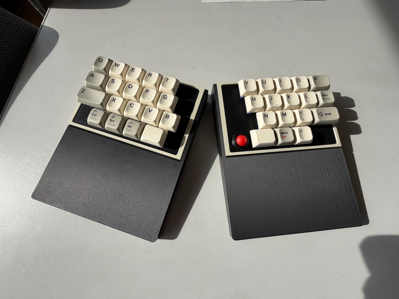 自分専用の分割キーボードは見ての通り、キー数は36キーで、赤いボールは12mm球を使ったトラックボールです。メーカー品には、ないような構成です。ここまで尖った構成のものを求めていなければ、メーカー品の分割キーボードがいいです。5〜6年、趣味でキーボードを設計したからこそ、いまの状況は自作の分割キーボードを購入するよりも、メーカー品の分割キーボードを購入する方が、よいと思います。
