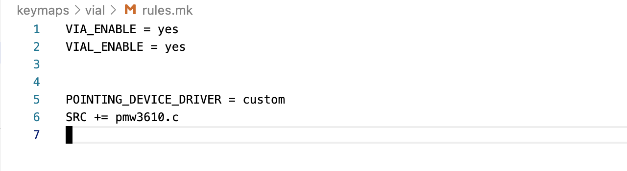 Auto-kdkでトラックボール搭載の有線接続のキーボードを設計すると、ファームウェアも生成してくれます。その生成されたファームウェアを開いて、マウスセンサーモジュールをいじれば、なんとかなるかなと思いつき、やってみたら、ビルドができて、qmk_firmwareでPWM3610を動かすことができました。