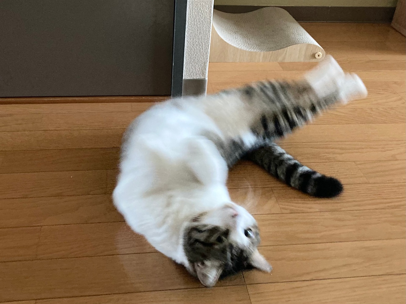 真夜中になると、猛ダッシュしたりマオーンと雄叫び上げたり床の上で腹を出してのたうったりしている。稽古すな。