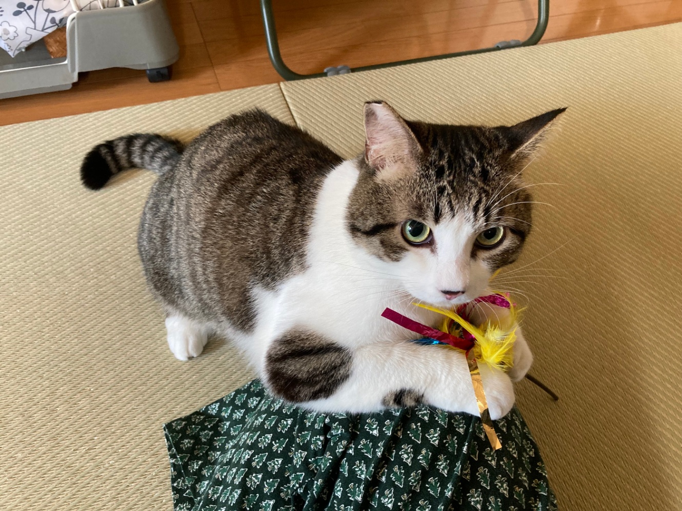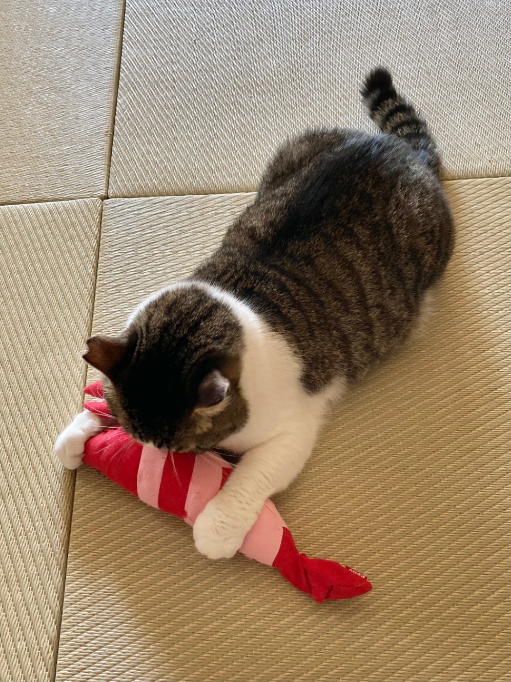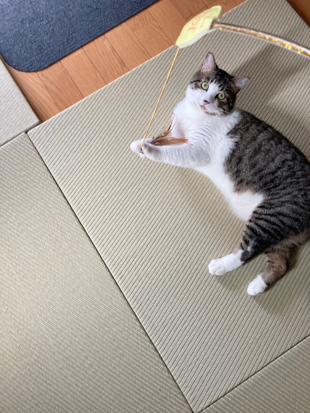その後ふたりで猫じゃらしで遊びまくり、双方疲れて早めに寝落ち、夜中トイレ以外に目を覚まさずどちらもよく寝た。やっと緊張が解けてきた気がする。