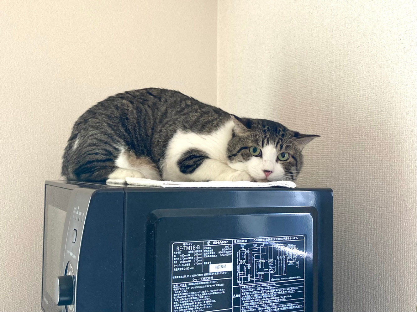 これはうっかり台所で私と鉢合わせして電子レンジの上に逃げて警戒してる横綱。そのレンジ使いたいんですけど。