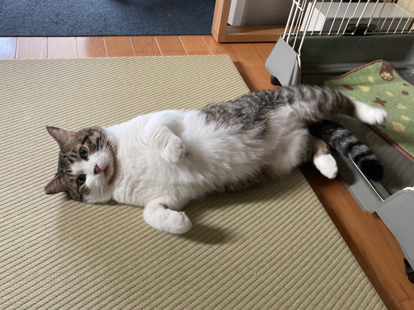 畳を敷いていると猫間富士の体重で跳んだり走ったりしてもドスドス音がかなり減って良い。本猫も足にやさしいのか、猫タワーから降りるときにわざわざ畳のある場所を選んでいる。