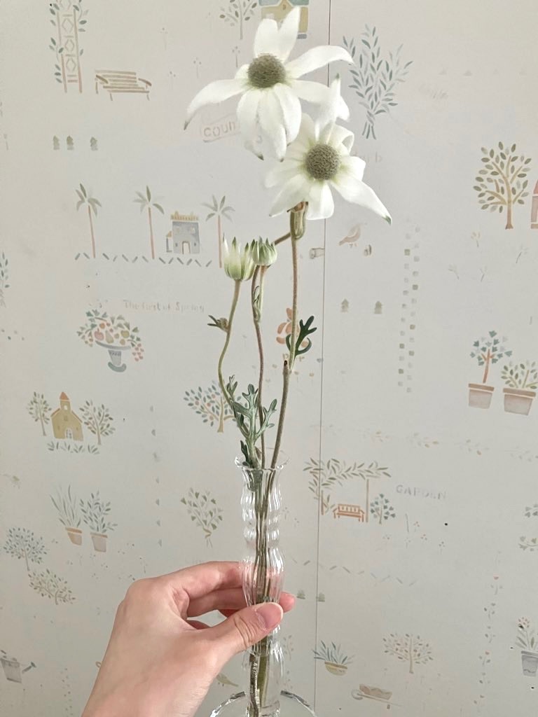 買った花、綺麗だ 少し萎れてきたけどほわほわでうれしい 次はチューリップを買いますよ