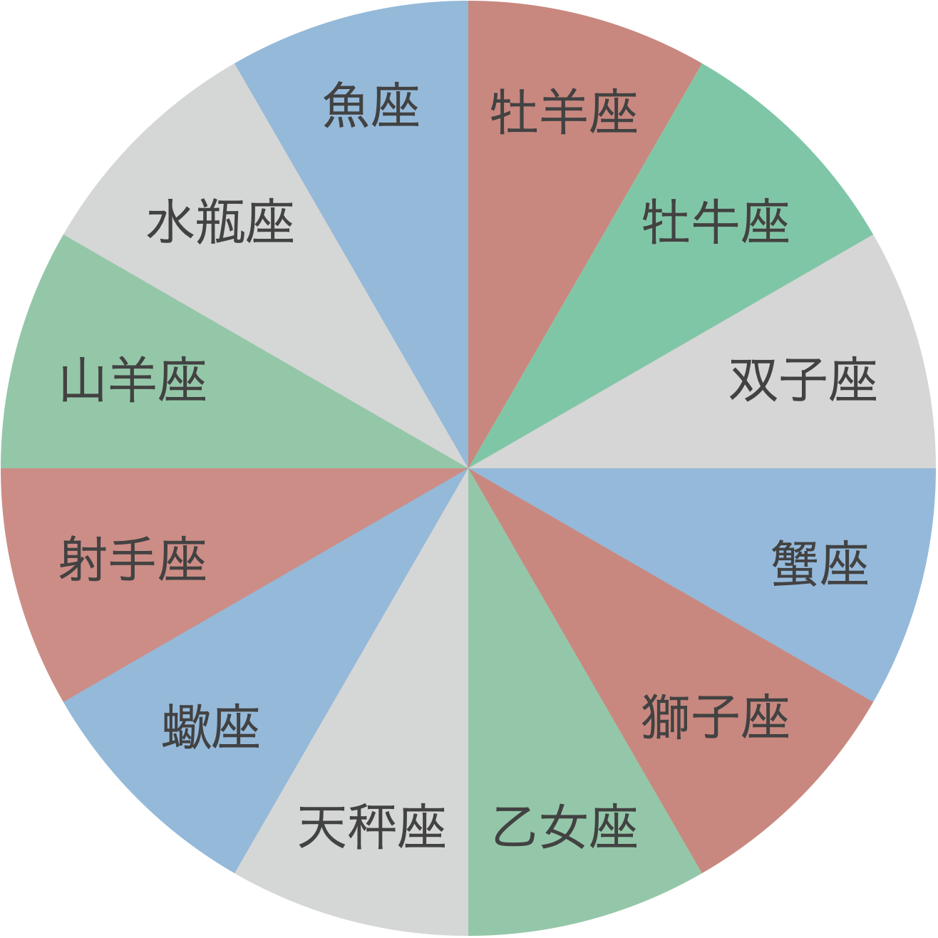 12星座では、始まりの牡羊座から順番に四元素があてがわれます。