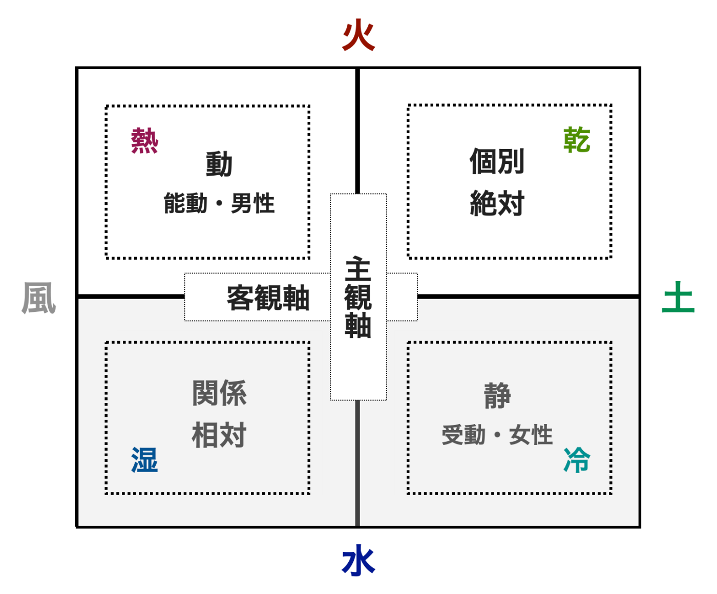・「火 - 土」は乾という性質で、個々の事物を想定します。他の個体との相対的な関係は意識せず、独立した別個のものとして絶対的に物事を捉えます。「風 - 水」は湿という性質で、もの同士のつながりを想定します。複数の事物や全体のつながりや連関、相互作用を中心に物事を捉えます。
